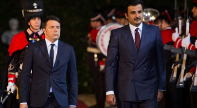Il Primo Ministro italiano Matteo Renzi ha ricevuto a Villa Madama l’emiro del Qatar, lo sceicco Tamin bin Hamad al-Thani.L'emiro del Qatar, lo sceicco Tamim bin Hamad bin Khalifa Al-Thani, è arrivato a Roma per una missione incentrata sugli affari, durante la quale sono stati firmati accordi, non solo nel settore economico.