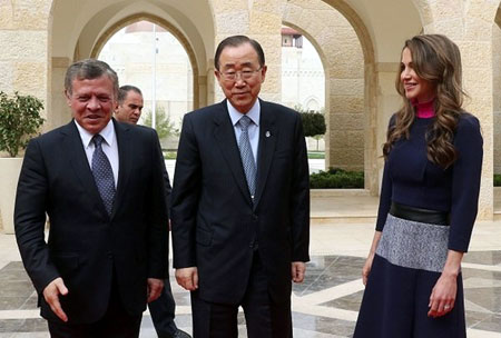 Il Segretario generale delle Nazioni Unite Ban Ki-Moon e il presidente della Banca mondiale Jim Yong Kim hanno incontrato il Re Abdullah II e la Regina Rania di Giordania presso il Palazzo Reale di Amman per discutere sulla situazione dei rifugiati siriani e in particolare su come sostenere la Giordania.