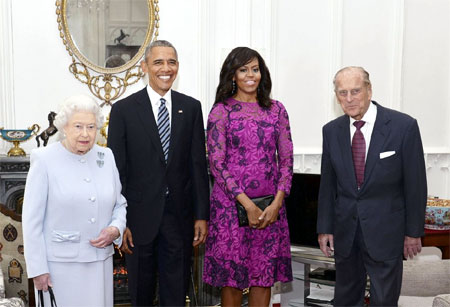 Il presidente americano Barack Obama, con la moglie Michelle, è arrivato al castello di Windsor a bordo dell'elicottero "Marine One" per il pranzo alla Oak Room con la regina Elisabetta per celebrare i 90 anni della sovrana , compiuti il 21 aprile. Per Obama è la 5°