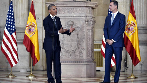 Sua Maestà il Re Felipe VI ha personalmente accolto il Presidente degli Stati Uniti d'America, Barack Obama, alla base aerea di Torrejòn de Ardoz , in Spagna, proveniente da Varsavia, dove aveva partecipato al vertice della NATO.Per Barack Obama è la prima volta che da presidente americano è andato in Spagna e la sua visita è il primo presidente