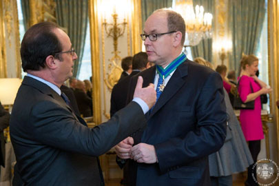 Il presidente francese Francois Hollande ha consegnato al Principe Alberto di Monaco la medaglia dell'Ordine al Merito Marittimo.La cerimonia si è svolta al Palazzo dell'Eliseo a Parigi, la decorazione viene assegnato ad una persona che si è distinta nel settore marittimo.