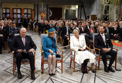 Il Re Harald e la Regina Sonja di Norvegia, il principe ereditario Haakon e la Principessa Mette-Marit, hanno partecipato alla cerimonia del Premio della Pace 2015 che si è svolta nel Municipio di Oslo.