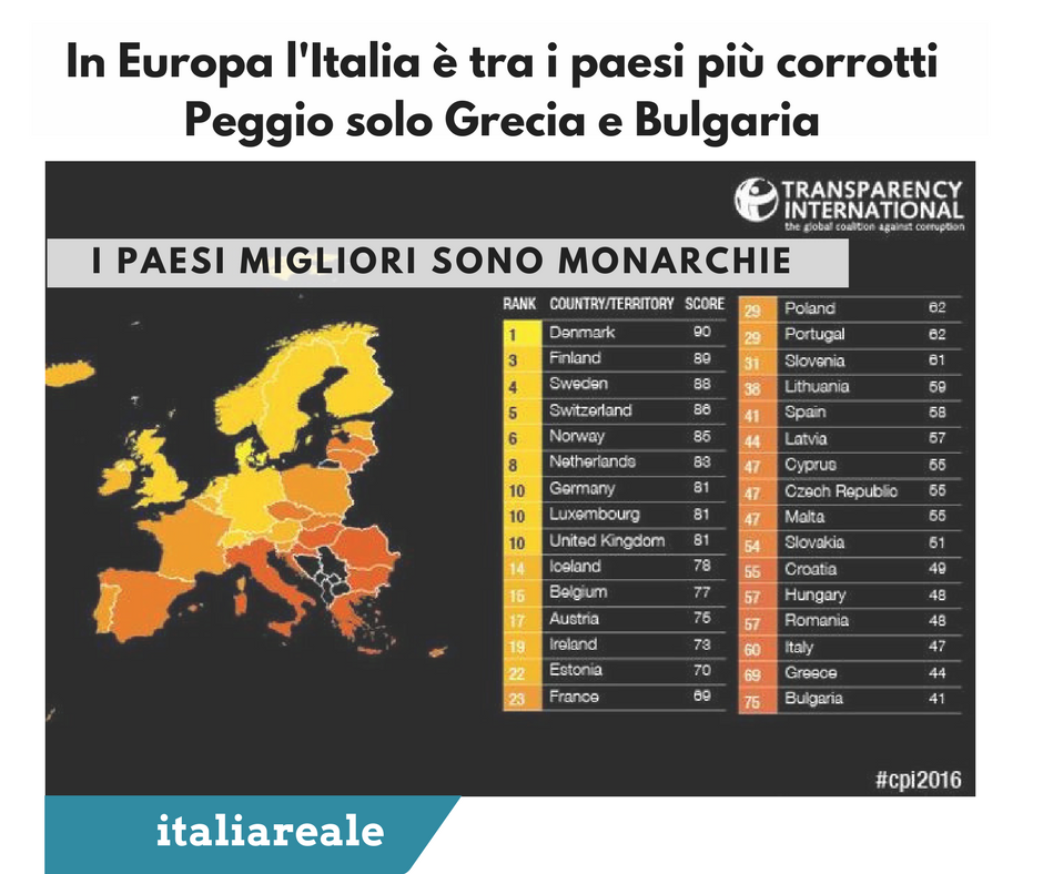 In Europa l'Italia è tra i paesi più corrotti. Peggio solo Grecia e Bulgaria. I paesi migliori sono monarchie